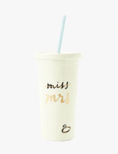 Nothing says, “I’m engaged!” like drinking coffee (or iced tea) out of a miss-to-mrs mug. This Kate Spade one is great to bring on the go—so she can show off her ring and new engagement status everywhere she goes.