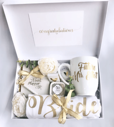 If you’re celebrating their love from afar, send the couple something special to let them know you’re thinking of them. This themed gift box—filled with a diamond pen, notebook, coffee mug, happily ever after candle, matches, bride t-shirt and lip balm—comes wrapped and assembled, so you can mail directly to your friend. You can even add a personalized congratulations card.